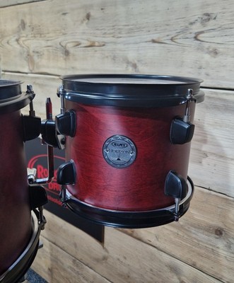 This Horizon model is finished in rubbed wax cherry lacquer, with black hardware, isolated tom mounts and mixed hybrid birch shells.
